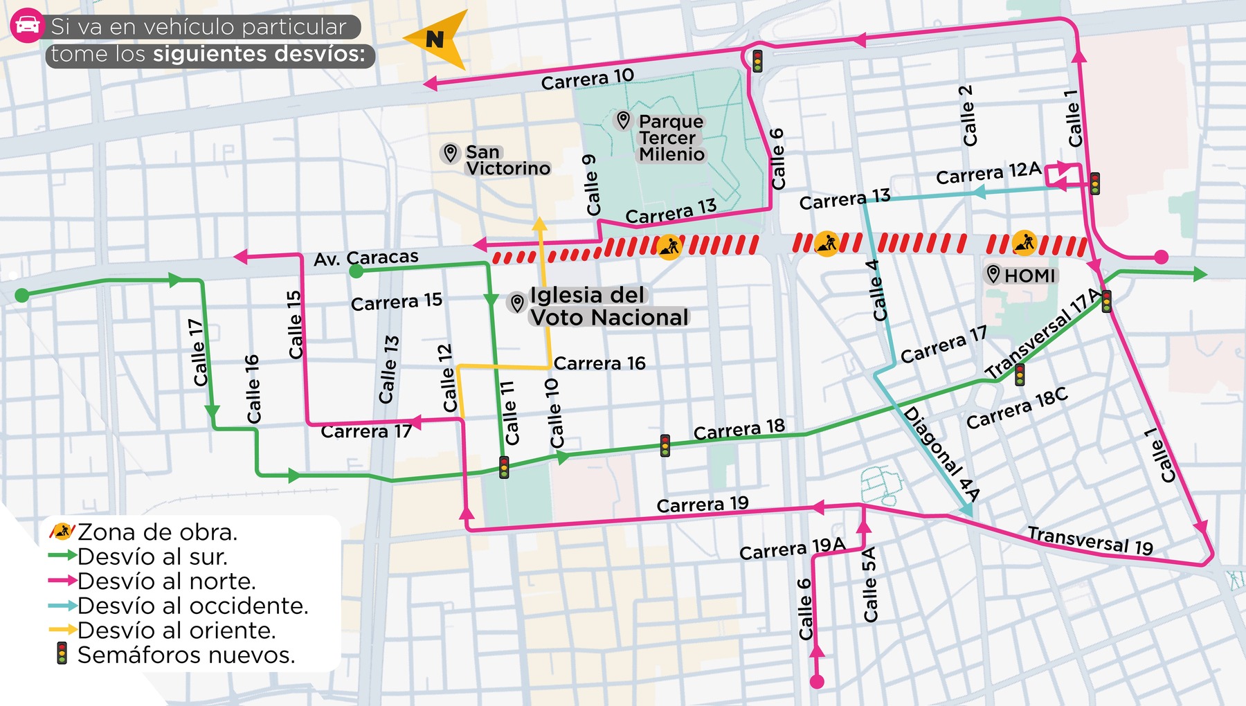Los vehículos que se dirijan hacia el sur por la avenida Caracas deberán desviarse hacia el occidente por las calles 17 u 11 para buscar la carrera 18, donde podrán continuar hacia el sur, y a la altura de la transversal 17 A podrán retomar la Caracas hacia el sur.