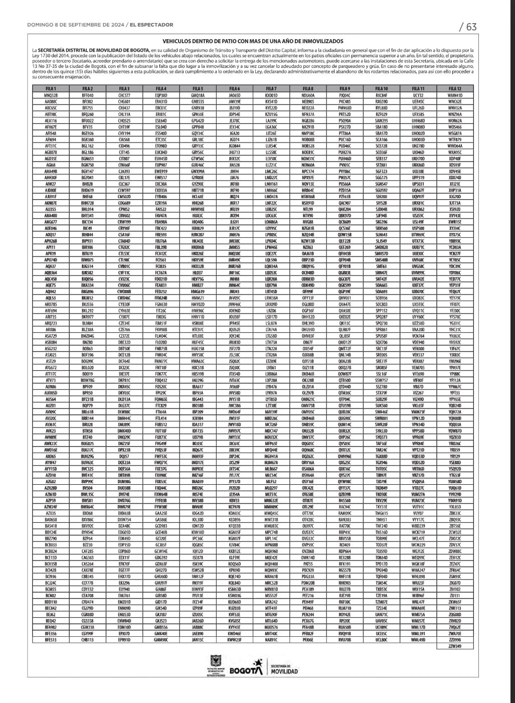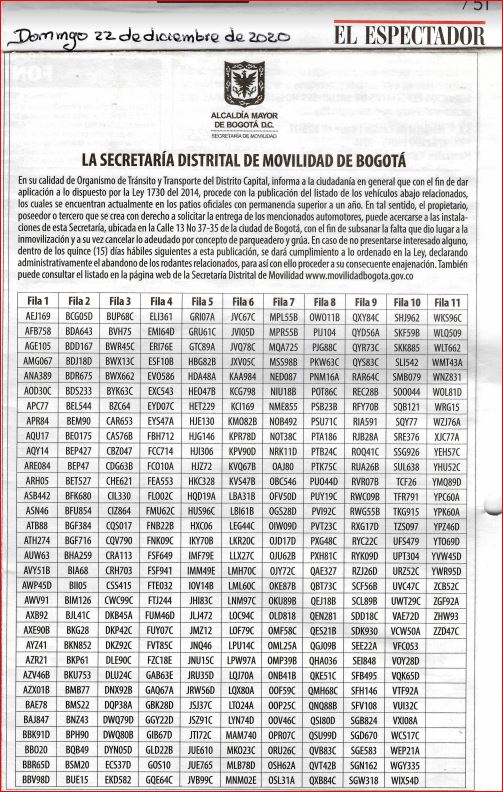 "Estas son las publicaciones que en cumplimiento de lo ordenado en la Ley 1730 de 2014, ha llevado a cabo, hasta la fecha, la Secretaría Distrital de Movilidad, para el conocimiento de la ciudadanía en general. Las personas que se crean con derecho sobre los vehículos publicados, pueden acercarse a la Secretaría Distrital de Movilidad para hacer el retiro efectivo de los mismos de los parqueaderos de la Entidad y a cancelar lo adeudado por dicho concepto."