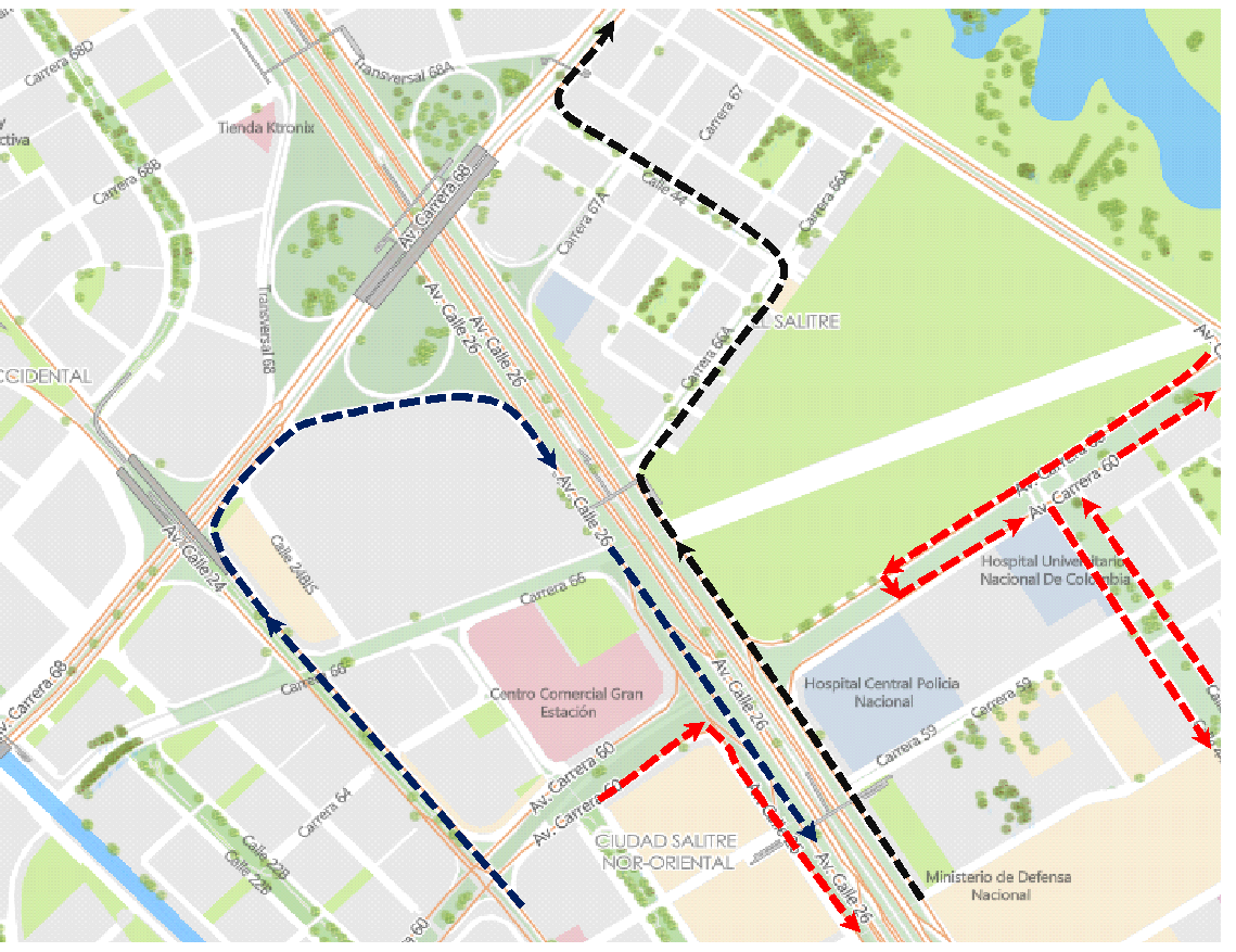 • Los usuarios que transitan sentido Oriente - Occidente por la Av. La Esperanza y toman la Av. carrera 60 al Norte, deberán continuar al Occidente por la Av. la Esperanza, Av. carrera 68 al Norte y  Av. calle 26 al Oriente (Mapa 2 – color azul).