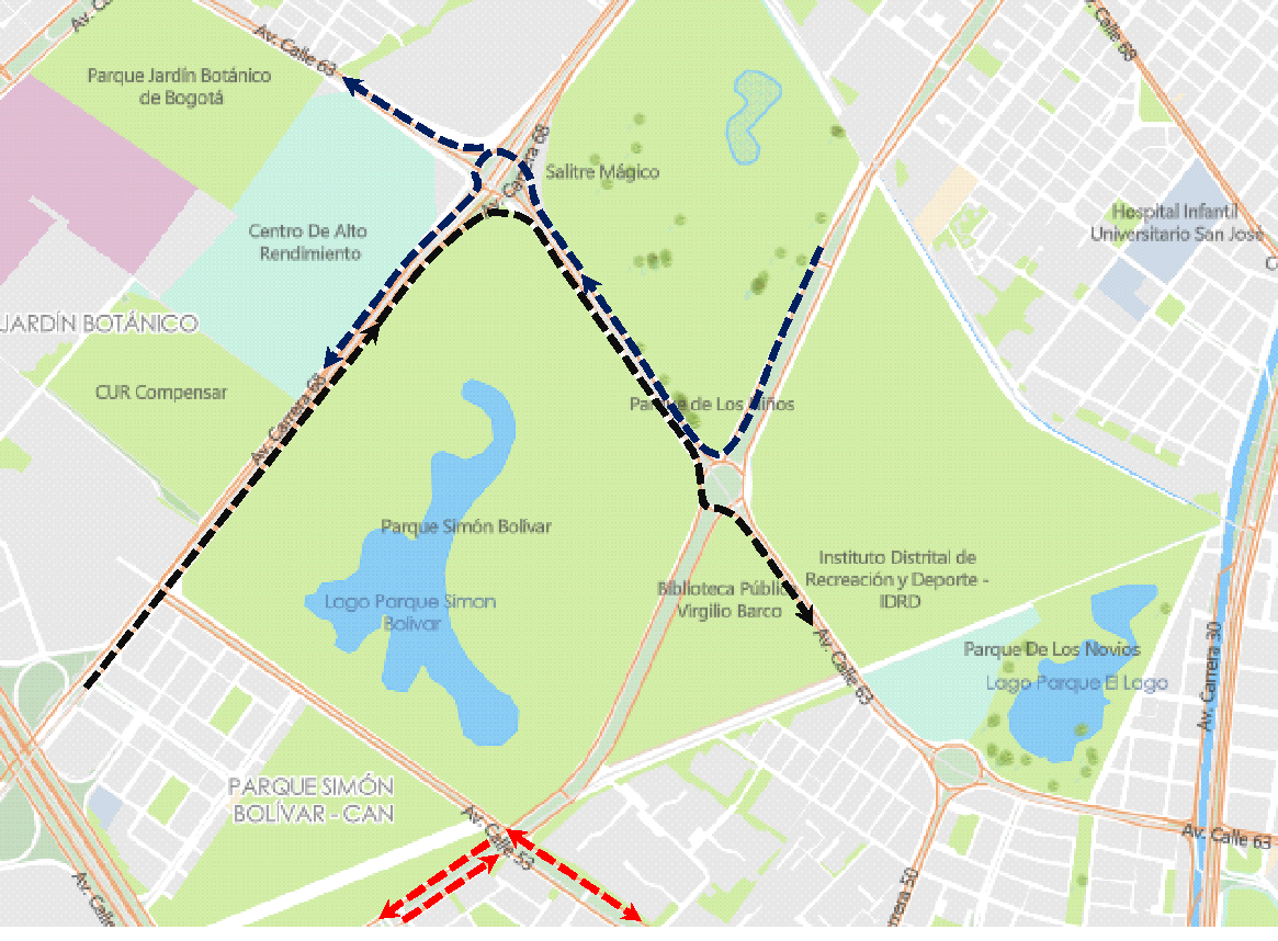 • Los usuarios que transitan sentido Norte - Sur por la Av. carrera 60, deberán tomar la Av. calle 63 al Occidente y Av. carrera 68 al Sur o Av. Rojas al Sur (Mapa 3 – color azul).