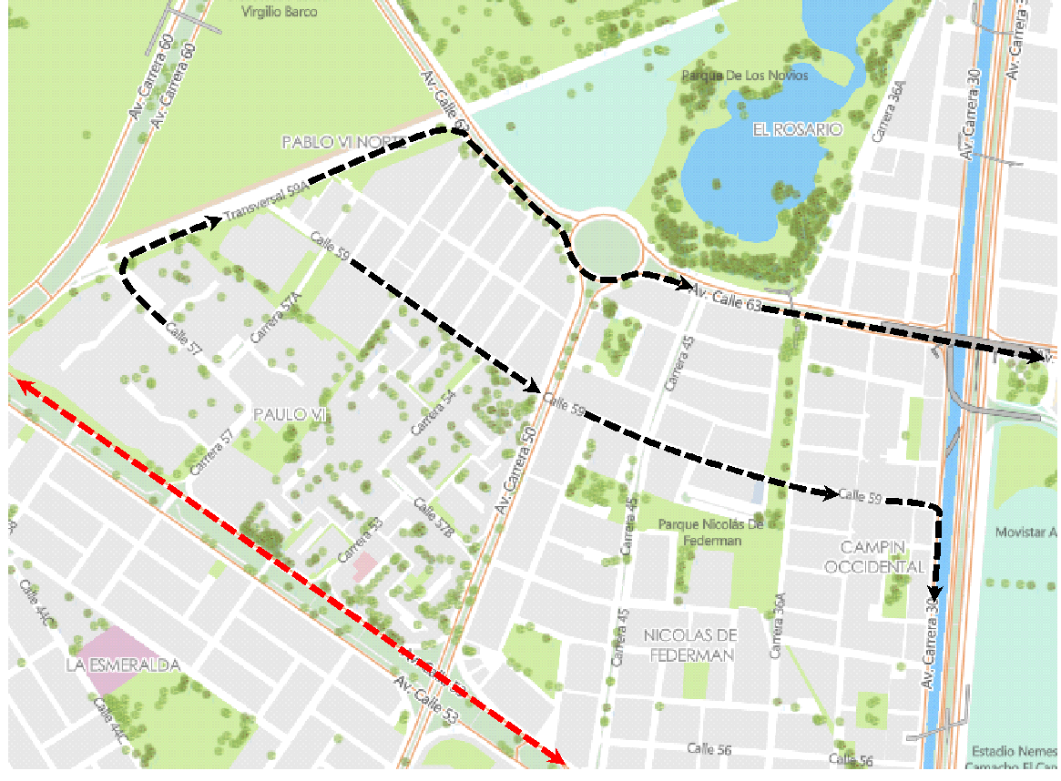 • Los residentes del sector de Paulo VI podrán ingresar al sector desde el Oriente por la calle 59 o Av. calle 63, Av. carrera 50 al Sur y calle 59 (Mapa 5).