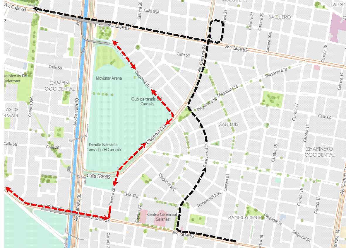 • Los usuarios que transitan en sentido Oriente – Occidente por la Av. calle 53, deberán tomar carrera 24, transversal 24 al Norte y Av. calle 63 al Occidente (Mapa 6).