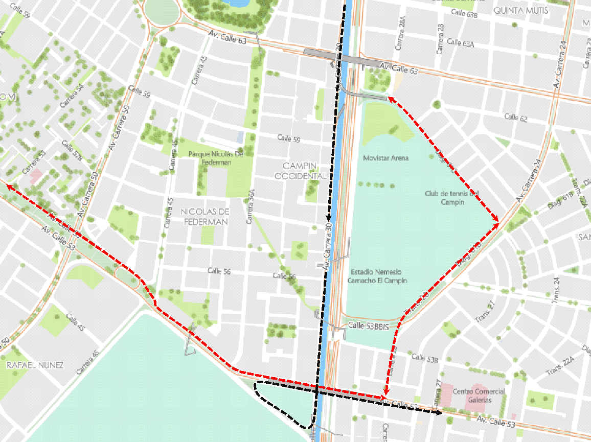 • Los usuarios que transitan sentido Sur - Norte por la Av. carrera 68 y toman la Av. calle 53 al Oriente, deberán continuar por Av. carrera 68 al Norte y Av. calle 63 al Oriente (Mapa 3 – color negro).